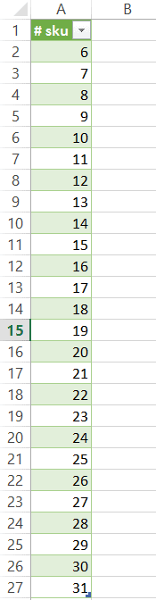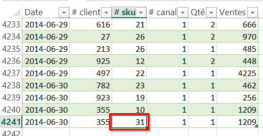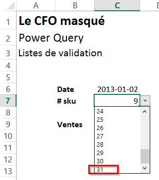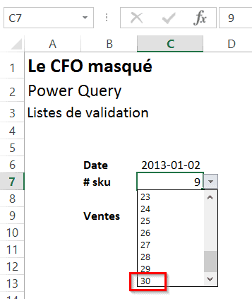 Pour obtenir une liste déroulante avec les #skus uniques, nous utilisons simplement l’option “liste” disponible dans la validation de données. Si vous souhaitez en apprendre davantage sur la validation de données, vous pouvez relire l’article: Astuce Excel: Validation de données (Data validation). Dans notre exemple, vous noterez que les #skus vont jusqu’au #30.