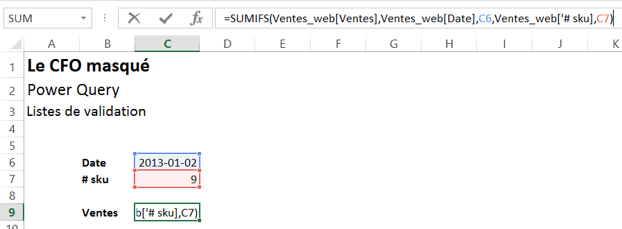 Supposons que nos deux listes servent à alimenter une zone de calculs, comme celle présentée ci-bas. Nous souhaitons ainsi qu’un utilisateur puisse choisir une date et un #sku pour connaître le total des ventes.