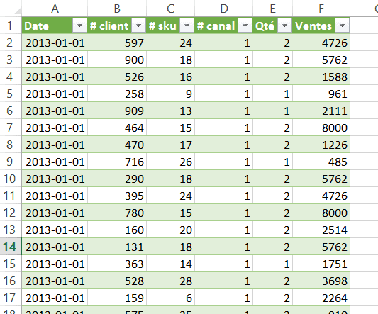 Pour illustrer comment créer des listes déroulantes dynamiques et sans doublons, à partir d’une base de données, nous allons utiliser la base de données suivante, qui regroupe les ventes journalières d’un site web (canal #1). Dans un premier temps, si ce n’est pas déjà fait, nous devons convertir notre base de données sous forme de tableau. Pour savoir comment faire, je vous invite à relire l’article: Découvrez la magie des tableaux Excel.