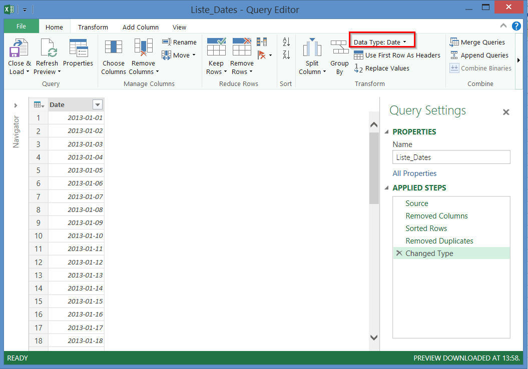 Nous utiliserons la même technique pour créer une liste de dates uniques, en ajoutant une étape, soit celle de convertir le format des données en format “date”.