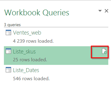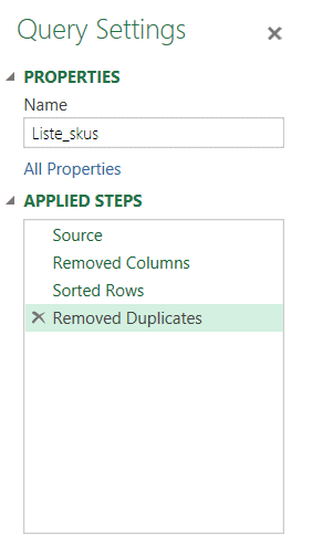 Comme nous avons enregistré ces 4 étapes de transformation avec Power Query, nous pourrons facilement, plus tard, mettre à jour la liste, pour tenir compte des nouveaux #skus qui feront leur apparition dans le temps.