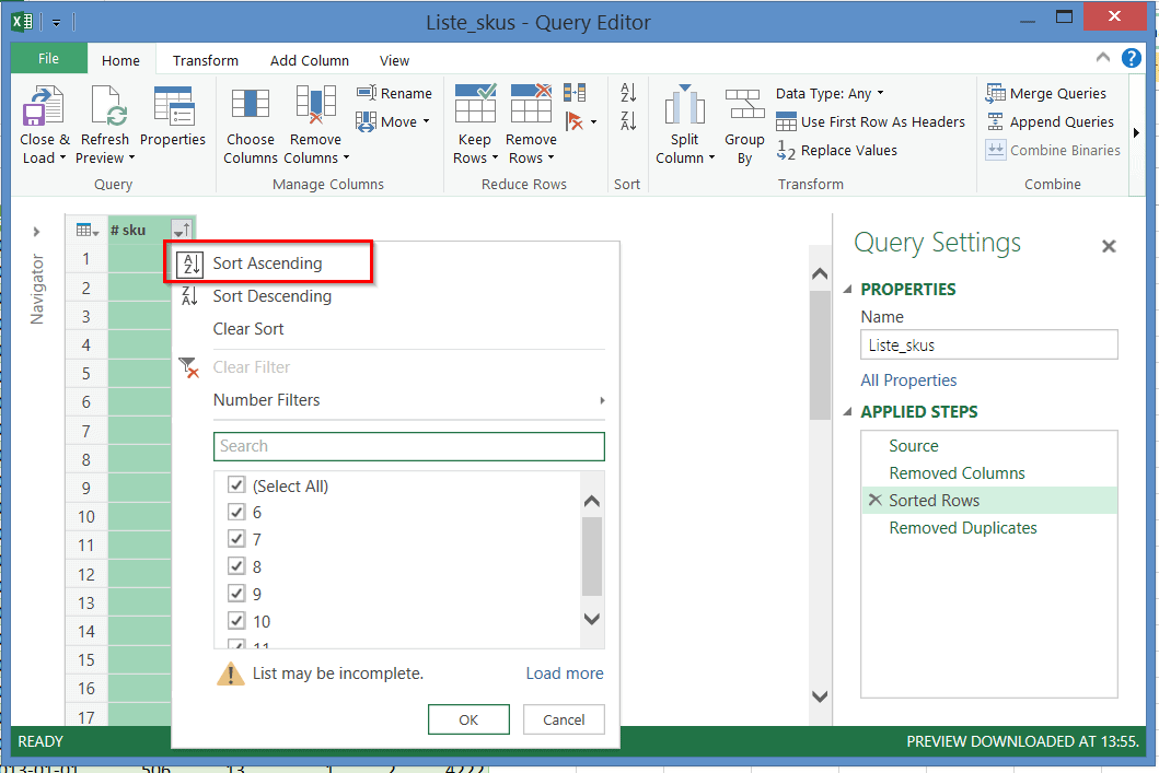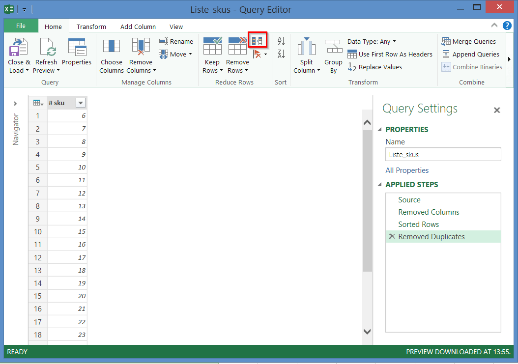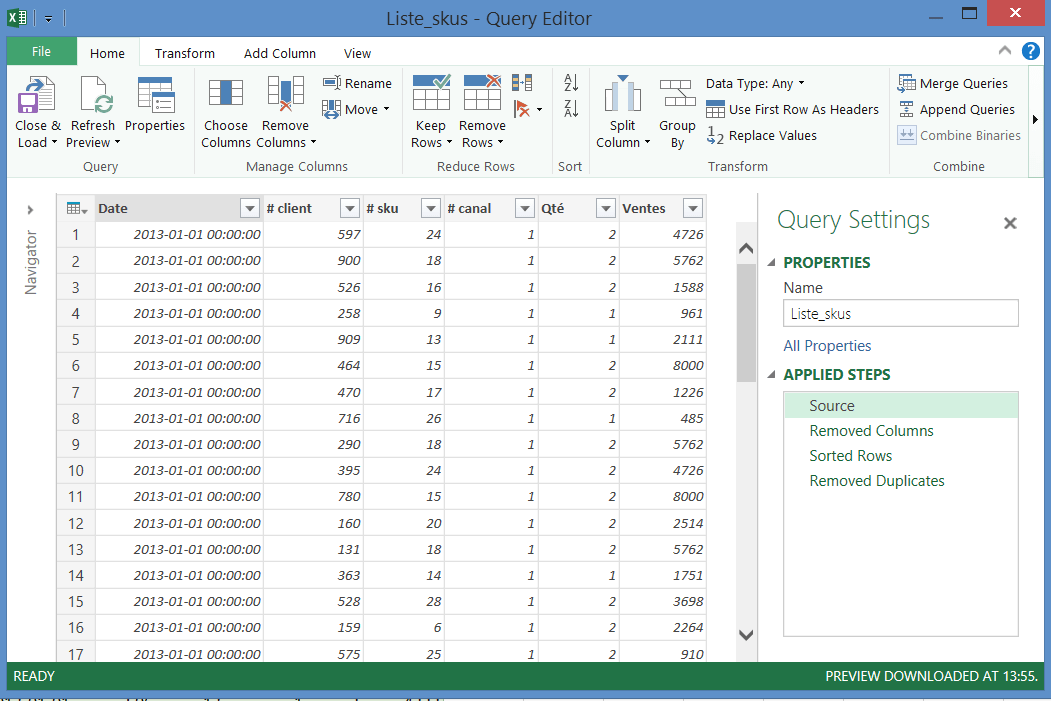 Afin d’obtenir une liste de #skus sans doublons, nous allons enregistrer 4 étapes dans Power Query. La première étape consiste simplement à importer la table de données qui réside dans notre fichier Excel.