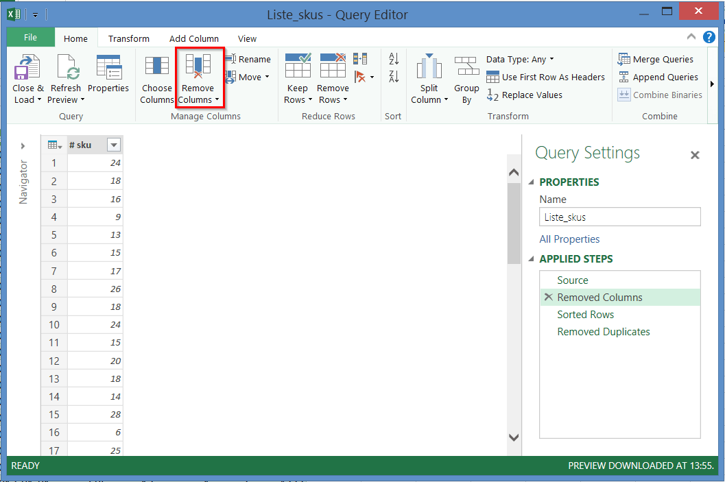 La deuxième étape de transformation consiste à supprimer les colonnes excédentaires, pour ne conserver que la colonne avec les #skus.