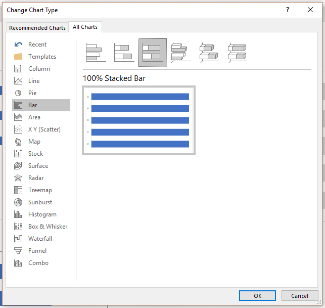 Pour cette raison, vous devez modifier votre type de graphique et choisir le graphique empilé à 100% (100% stacked bar).