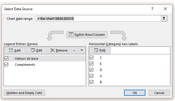 À cette étape-ci, il pourrait être tentant de simplement aller sélectionner notre colonne Écart à 100% pour l’ajouter à notre graphique. Toutefois, le graphique à barres régulier travaille avec une seule série de données. Il ne permet donc pas cette action.