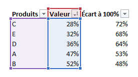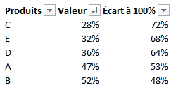 Pour illustrer notre exemple, nous utiliserons les données ci-dessous. La colonne Valeur comprend les valeurs associées à chacune de nos données. La colonne Écart à 100% est une colonne calculée. Elle fait la différence entre 100% et la valeur sous-jacente. Notez que nous avons posé des filtres sur notre table et que nous l’avons triée en ordre croissant de valeurs.