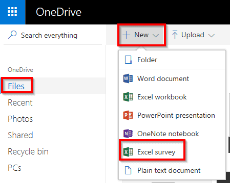 Pour créer un sondage, vous devez vous créer un compte personnel sur OneDrive. Ensuite, vous cliquez sur Files (Fichiers) et puis sur New (Nouveau) et ensuite, vous choisissez l’option Excel Surveys (Sondages Excel).