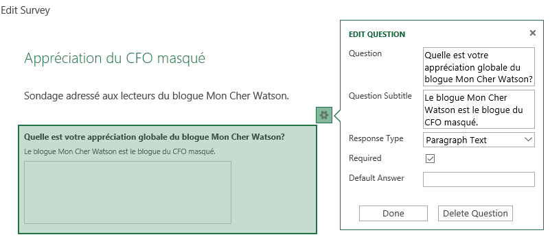 Si vous êtes à la recherche d’un outil pour créer des sondages, les publier en ligne et compiler les résultats aisément dans Excel, vous serez heureux de découvrir Excel Surveys.