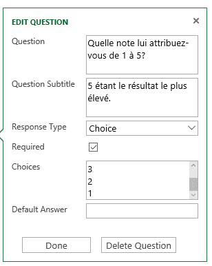 Pour entrer votre première question, cliquez sur la roulette de paramètres à droite de la première boîte et remplissez les informations demandées.
