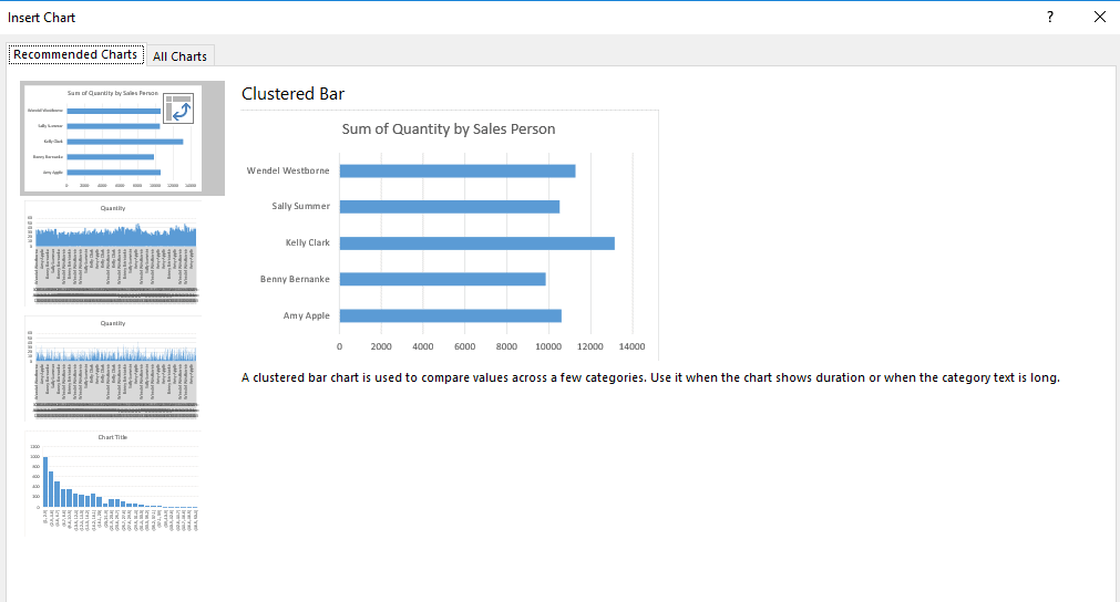Toujours avec l’option d’analyse rapide, obtenue en sélectionnant la plage de données, vous pouvez choisir l’option Charts/Graphiques et voir des aperçus de différents graphiques de vos données.