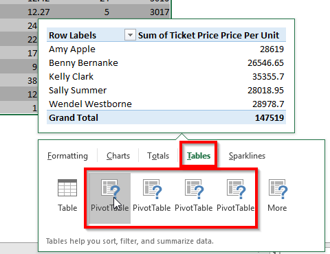 Vous verrez une option intitulée Tables. Cette option vous permettra de mettre votre plage de données sous forme de tableau, si elle ne l’est pas déjà, ou de créer un tableau croisé dynamique à partir de cette plage de données. En passant la souris sur les différentes options, vous pourrez voir un aperçu du tableau croisé dynamique proposé. Mais attention! Les propositions ne sont pas toujours pertinentes. Par exemple, ci-dessous, on présente la somme des prix de vente de billets unitaires par vendeur, ce qui n’est certainement pas intéressant. L’analyse rapide vous permet donc de créer rapidement des tableaux croisés dynamiques mais n’allez pas trop vite non plus!