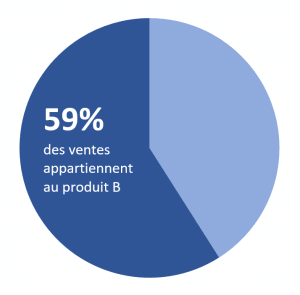 - Se demander toujours quel est le message à véhiculer. Par exemple, si vous avez deux catégories et que vous souhaitez mettre en évidence la plus grande valeur, vous pourriez mettre cette portion en couleur plus vive pour attirer l’œil du lecteur et indiquer directement la conclusion que vous souhaitez mettre de l’avant. Ici, le message devient très clair : le produit B domine les ventes.