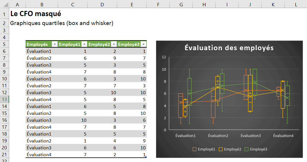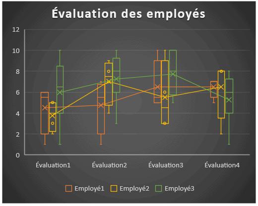 Le graphique en quartiles Box & Whisker nous aide à visualiser les caractéristiques statistiques de chacune des évaluations effectuées.