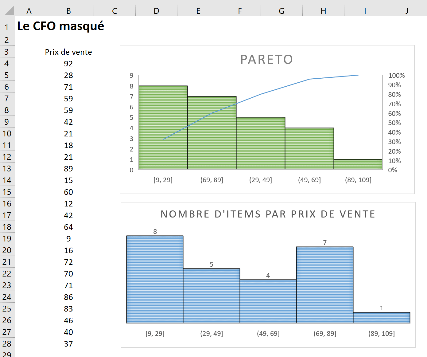 Il est possible de tracer un graphique histogramme à partir d’une série de données uniques, comme la liste des prix de vente des différents items à vendre dans une entreprise. À partir de cette liste, on peut d’abord créer un graphique qui représente le nombre d’items par prix de vente (voir le graphique en bleu ci-dessous). Ce faisant, Excel nous présente les données par regroupements de prix de vente (ces regroupements peuvent être personnalisés), par ordre croissant. Ainsi, dans le graphique ci-dessous, on constate qu’il y a 8 items dont le prix varie entre 9$ et 29$, et ainsi de suite. On peut ensuite créer un graphique de distribution, qui suit la loi de Pareto (voir le graphique en vert ci-dessous). Ce faisant, au lieu de présenter les regroupements d’items par ordre croissant, Excel les présente en commençant par le regroupement qui comprend le plus d’items et en terminant avec celui qui comprend le moins d’items. Ensuite, Excel ajouter une courbe de % (avec un axe secondaire en %) pour illustrer le concept de pareto (i.e. afficher le pourcentage cumulatif atteint après chaque ajout de regroupement d’items).
