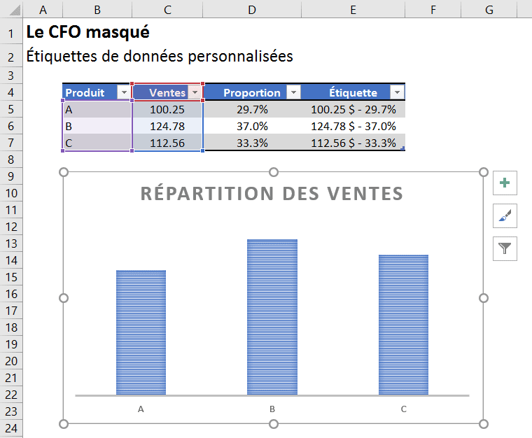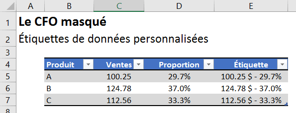Plus intéressant encore, si vous mettez vos données sous forme de tableau, chaque fois que vous ajouterez une nouvelle ligne de données, les colonnes “Proportion” et “Étiquette” seront générées automatiquement dans le tableau et elles apparaîtront également dans le graphique.