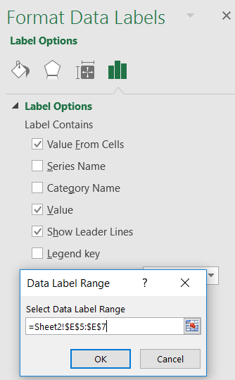Vous pouvez cocher la case “Value From Cells” (Valeur provenant des cellules) et Excel ouvrira une fenêtre afin que vous puissiez sélectionner la plage de cellules de votre tableau qui comprend les étiquettes de données: