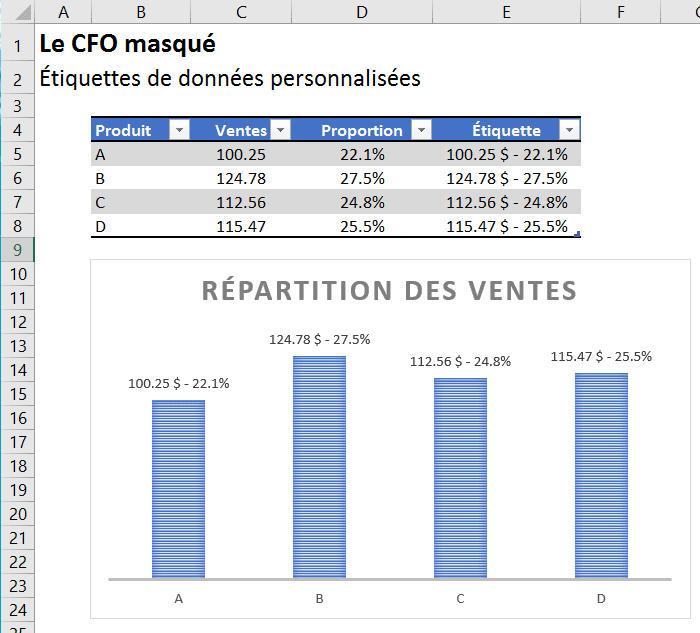 Pour illustrer la technique de personnalisation d’étiquettes de données d’Excel, nous allons utiliser les données du tableau ci-dessous.