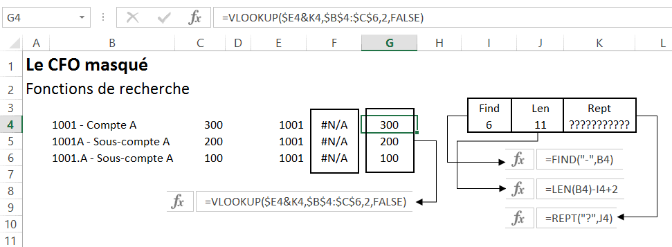 Si vous ne connaissez pas d’avance ce nombre de caractères, vous pouvez toujours procéder comme dans l’exemple suivant. Voici ce qui se passe sur la ligne 4. D’abord, nous utilisons la fonction Find (Trouve) pour trouver la position du symbole -. Une fois que nous avons récupéré la position de ce symbole, nous utilisons la fonction Len (Nbcar) pour trouver le nombre de caractères total dans l’expression de la colonne B. Nous retranchons ensuite de ce résultat la position du symbole – et nous ajoutons 2. Pourquoi? Parce que ce que nous souhaitons obtenir, c’est le nombre de ? à insérer dans notre fonction Vlookup (Recherchev). Nous devons donc obtenir au final, le nombre total de caractères, suivant l’expression en E, soit 1001 (il faut donc considérer l’espace et le symbole – ). Ensuite, nous utilisons la fonction Rept (Rept) pour répéter le symbole ? le nombre de fois nécessaire. Finalement, nous insérons le résultat de notre fonction Rept (Rept) dans notre fonction Vlookup (Recherchev). À noter que nous aurions pu écrire une seule formule avec l’ensemble de ces fonctions.