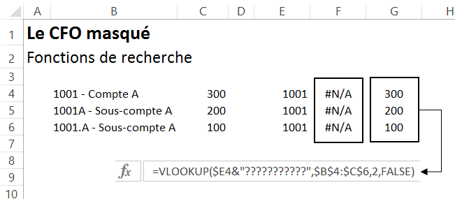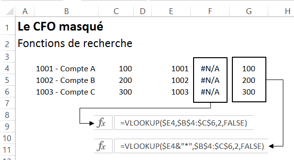 L’exemple suivant plaira sans doute aux comptables et aux professionnels qui doivent souvent aller chercher des informations complémentaires dans un autre onglet d’un même fichier ou dans un fichier externe. Par exemple, dans l’exercice suivant, dans les colonnes B et C, nous avons une première section de données qui représente les numéros de comptes de l’entreprise et les montants correspondants. Dans la colonne E, nous avons une autre section de données qui exige que l’on ramène les valeurs de la première section de données. En utilisant un Vlookup (Recherchev) conventionnel, on se retrouvera avec une série de #N/A puisque la valeur recherchée (soit 1001 sur la première ligne) n’appartient pas à la liste de valeurs dans la colonne B. Pour effectuer une recherche efficace, nous pouvons donc utiliser le symbole * pour spécifier à Excel que nous recherchons les comptes qui commencent par les chiffres indiqués dans la colonne E. Évidemment, cela suppose que tous les numéros de comptes soient uniques.