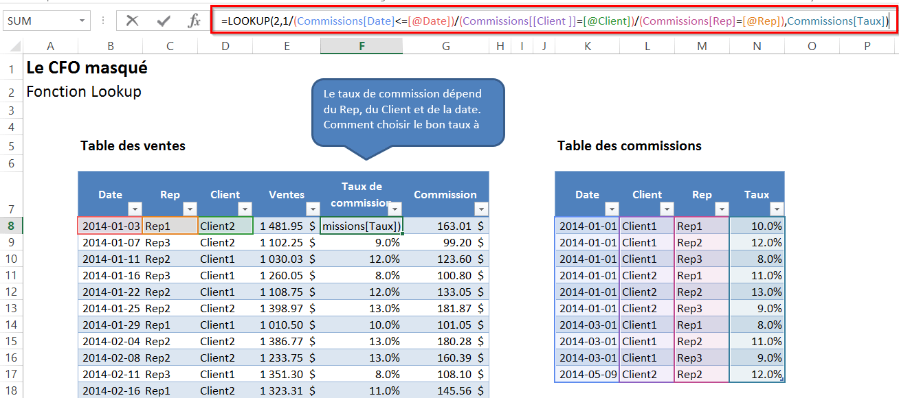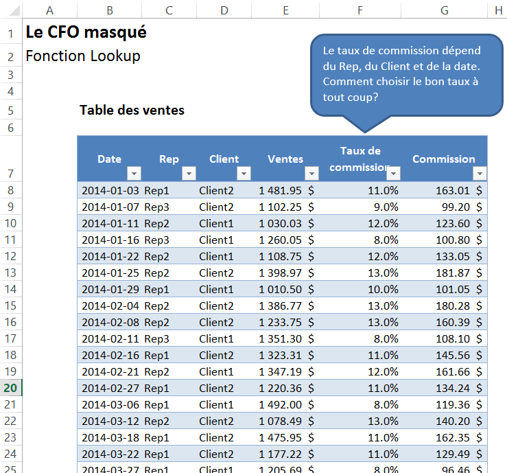À partir de cette table des commissions, vous devez insérer une formule dans votre table des ventes, pour calculer le taux de commissions approprié, pour chacune des transactions de vente. Vous devez donc utiliser une formule qui fournira le bon taux de commission, selon le représentant, le client et la date de la transaction.