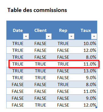 Autrement dit, pour la 1ère ligne de transactions de vente, la table de commissions retournait les résultats suivants, avec une seule ligne comprenant 3 valeurs True (Vrai), soit celle avec le 11% de commission.