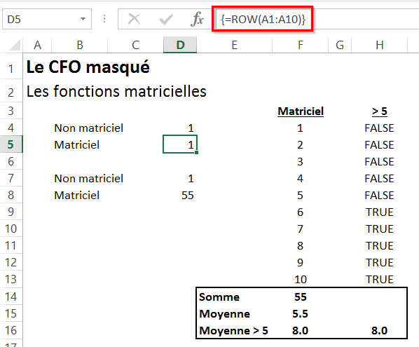 Dans l’exemple ci-bas, lorsque j’insère la fonction Row(A1:A10) (Ligne en français) dans une seule cellule, j’obtiens 1 lorsque je clique sur Enter directement (i.e., lorsque j’insère une fonction non matricielle) et j’obtiens 1 également lorsque je clique sur CTRL+SHIFT+ENTER (i.e. lorsque j’insère une fonction matricielle). Voir les cellules D4 et D5 dans l’image ci-bas.