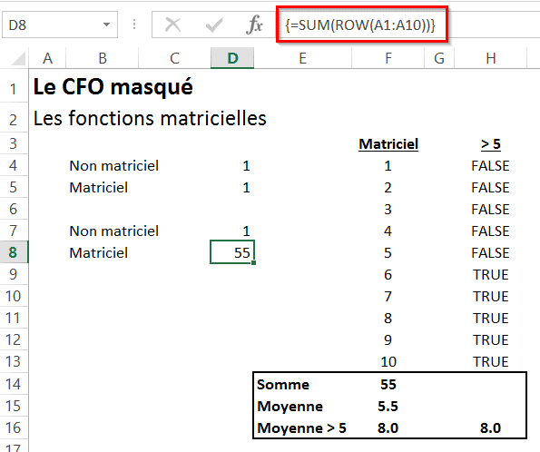 Par contre, si j’imbrique cette formule dans une somme (ou sum en anglais), on voit que la fonction matricielle renvoit un résultat de 55 (cellule D8) et la fonction non-matricielle un résultat de 1 (cellule D7). C’est normal puisque la fonction matricielle fait la somme de tous les numéros de lignes désignés par les cellules A1 à A10. D’ailleurs afin d’obtenir les chiffres de 1 à 10 dans la colonne F, j’ai d’abord sélectionné les cellules F4 à F13 et j’en ensuite entré la fonction matricielle de lignes. C’est ce qui a donné les résultats de 1 à 10 que l’on aperçoit dans l’image ci-bas (F4 à F13).