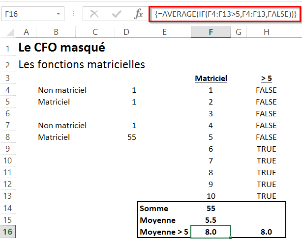 Les fonctions matricielles sont souvent utilisées avec des conditions, comme dans l’exemple ci-bas, où je calcule la moyenne des chiffres de la plage de données F4 à F13, qui sont supérieurs à 5. Vous pouvez jeter un coup d’oeil à la formule utilisée sur l’image ci-bas. Afin de résoudre ce calcul, Excel procède ligne par ligne et retourne un Vrai (True) ou un Faux (False) selon que le critère est rencontré ou non. Ensuite, il fait la moyenne des chiffres dont le critère est rencontré. Évidemment, tout ce que vous voyez, c’est le résultat final, soit le 8, dans une cellule unique.