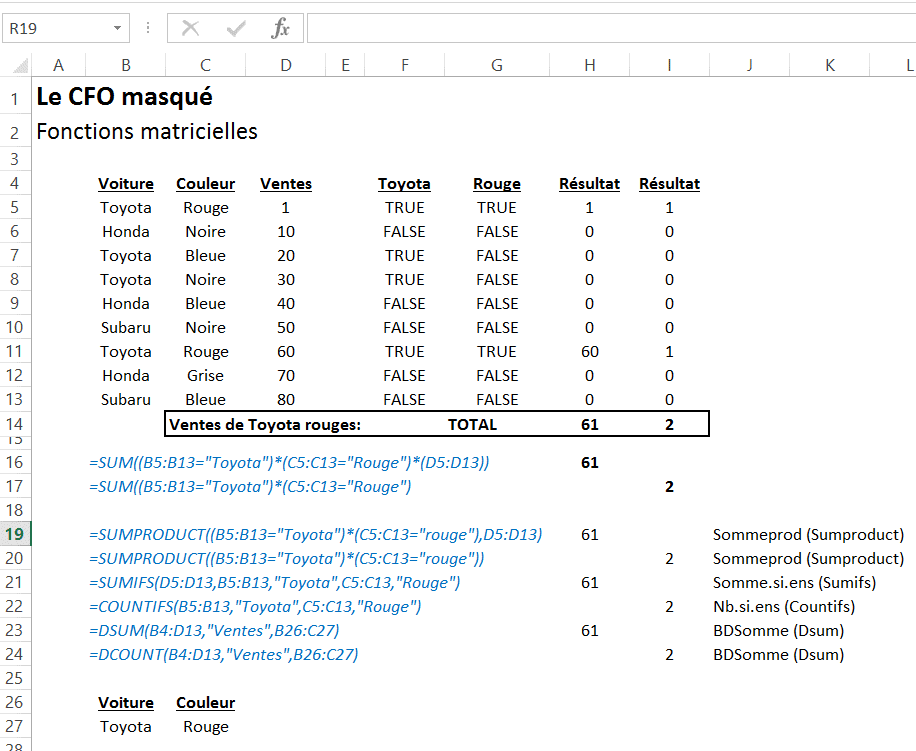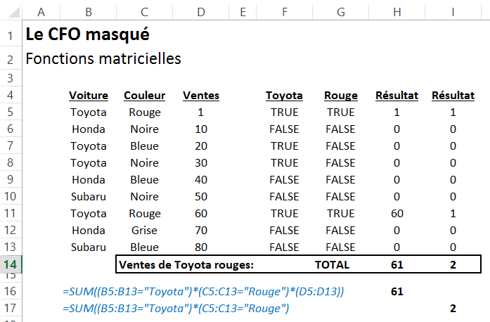 Dans l’exemple ci-bas, j’ai utilisé les fonctions matricielles afin d’obtenir la somme des ventes de Toyota rouges et le nombre de Toyota rouges vendues. Ici, les fonctions matricielles sont utilisées dans un contexte de critères multiples (plusieurs conditions). À noter qu’il existe une série de conventions dans Excel pour appliquer des logiques de calculs différentes dans les fonctions matricelles (et, ou, etc.).