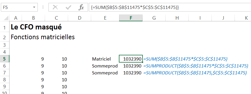 - Les fonctions matricielles qui sont appliquées à des plages ou des séries de données et qui agrègent ensuite ces données par le biais d’une somme, d’une moyenne ou d’un compte, et qui retournent donc un résultat unique dans une cellule unique (voir l’article suivant pour un exemple: Astuces Excel: Somme.si (sumif) avec plusieurs conditions)