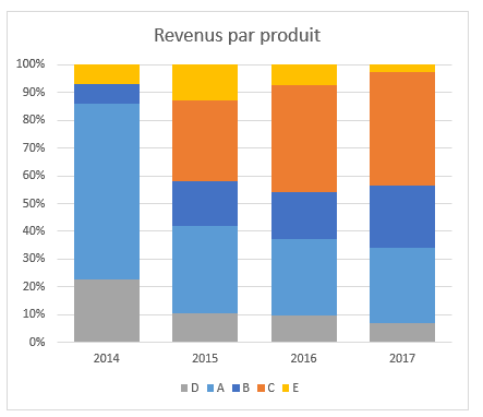 Pour montrer la proportion de chaque produit vendu au fil du temps, les usagers d’Excel vont souvent utiliser les graphiques en colonnes empilés à 100%. Par exemple, ci-dessous, on peut voir la proportion des ventes qu’occupe chacun des produits entre 2014 et 2017. Par contre, pouvons-nous tirer instantanément une conclusion par rapport à ces données?