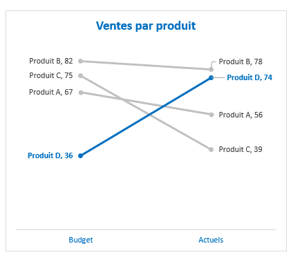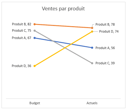 Pour que les gens comprennent rapidement si les ventes par produit sont supérieures à celles prévues au budget ou non, un graphique en pente serait peut-être plus approprié.