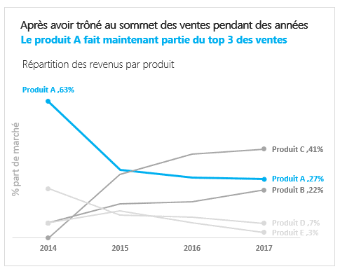 Un graphique en lignes, comme celui ci-dessous, nous permettrait davantage de comprendre qu’un des produits qui était jadis le plus important est devenu deuxième en importance, pas très loin devant le troisième produit.