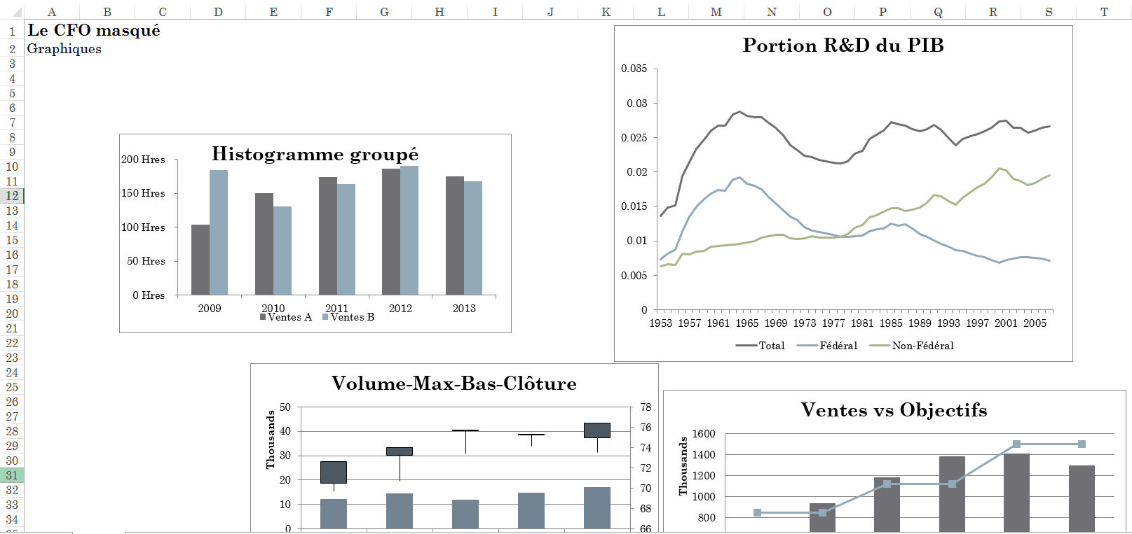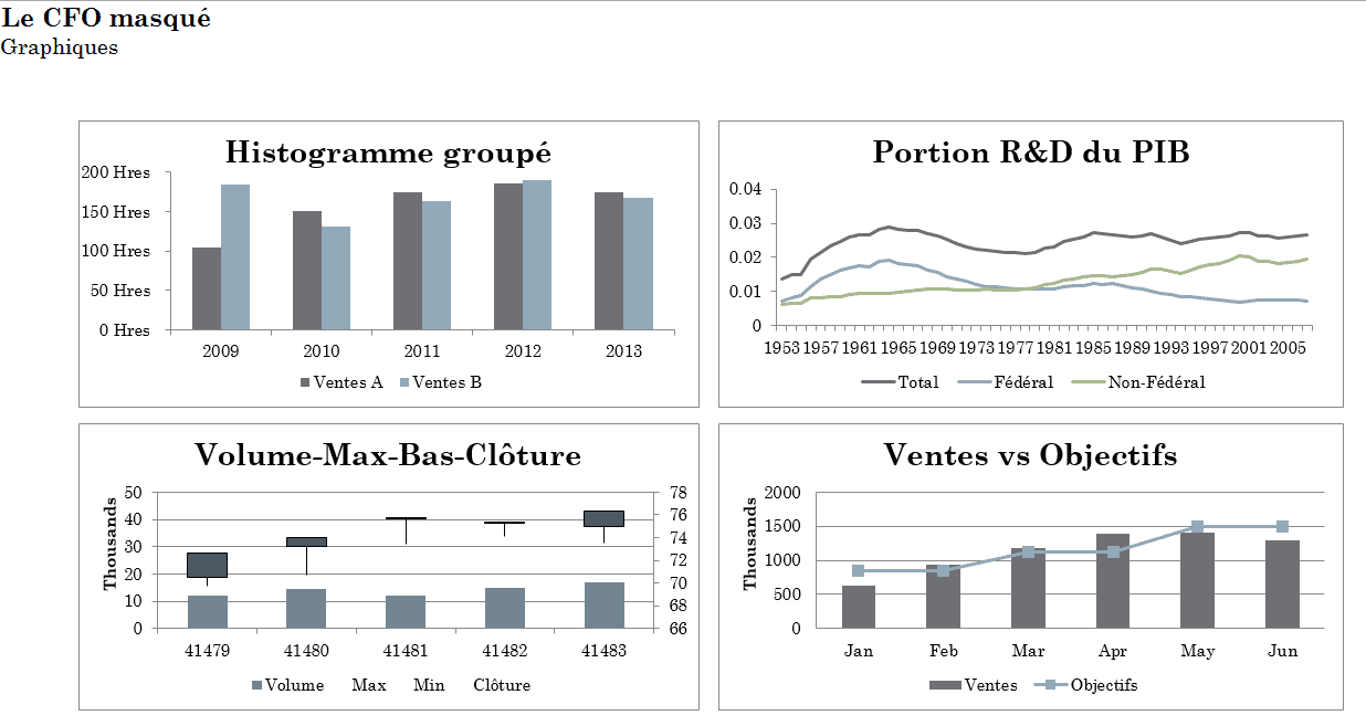 Supposons que dans votre démarche d’élaboration de votre tableau de bord, vous obteniez finalement les 4 graphiques suivants. Vous noterez que ces graphiques ont des tailles différentes et sont répartis de façon non structurée dans la feuille de présentation, qui sert à présenter le tableau de bord.