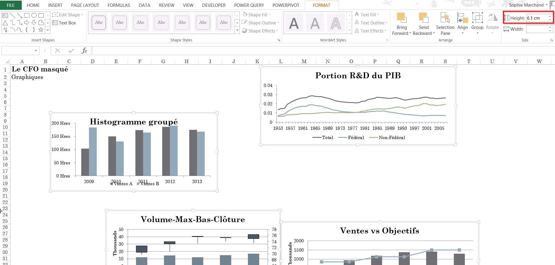 Dans notre exemple, nous avons donné une hauteur de 6.1 cm et une largeur de 13.3 cm à nos 4 graphiques.