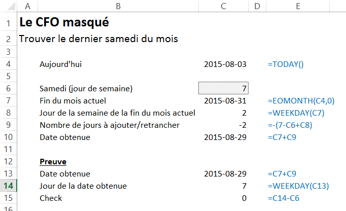 Vous trouverez ci-dessous la démarche pas à pas pour déterminer le dernier samedi du mois. Évidemment, vous pourriez imbriquer toutes les étapes illustrées dans une seule fonction mais l’idée ici, est de faire la lumière sur la composition de la formule utilisée.