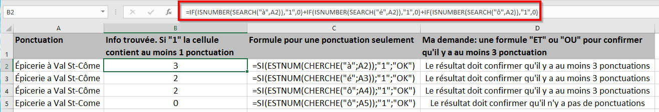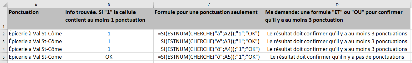 On comprend qu’il cherche une formule qui va lui indiquer qu’il y a au moins 3 accents dans l’expression de la colonne A. Therry a utilisé la fonction =SI(ESTNUM(CHERCHE(“à”;A2));”1″,”OK”).