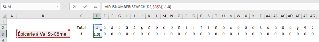 Pour cette raison, il serait sans doute préférable de bâtir un tableau comme le suivant et de placer toutes les valeurs possibles d’accents et d’y insérer la formule initiale de Therry. Ensuite, il ne suffira qu’à faire la somme des résultats. À noter que Therry avait mis son 1 entre guillemets dans sa fonction SI. Si on veut pouvoir faire la somme des 1, il ne faut pas mettre le 1 entre guillemets, sinon il sera considéré comme du texte et ne pourra pas être additionné.