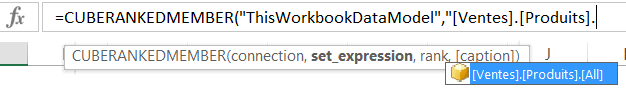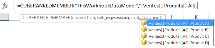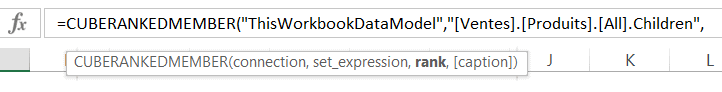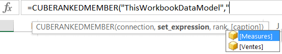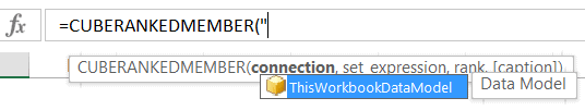 Pour utiliser la fonction Excel RANGMEMBRECUBE (CUBERANKEDMEMBER), vous devez d’abord sélectionner la connexion, en guise de premier paramètre. Dès que vous ouvrirez les guillemets, Excel vous proposera les choix disponibles. Dans l’exemple ci-bas, mes données logent dans un modèle de données Power Pivot. Je dois donc choisir “ThisWorkbookDataModel”..