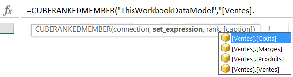 Comme deuxième paramètre, Excel vous demande l’expression du jeu. Vous pouvez choisir une mesure ou une dimension. Ci-dessous, “[Ventes]” représente l’unique table de données de mon modèle de données. Cette table comprend une colonne avec la dimension produits et trois colonnes de mesures: ventes, coûts et marges par produit. Ici, je choisis ma table de ventes car mon objectif est de présenter une liste des produits de mon modèle dans Excel.