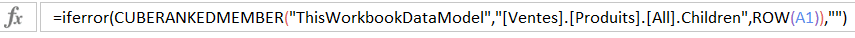 Comme je ne suis pas supposée connaître à l’avance le nombre de produits qui composeront ma liste et comme cette liste est susceptible de croître au fil du temps, je vais imbriquer ma fonction à l’intérieur d’une fonction Sierreur ou Iferror. De cette façon, ma liste ne présentera que les produits du modèle de données et ensuite, des cellules vides.