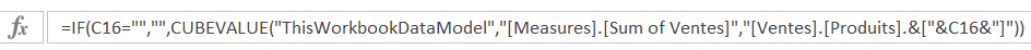 Dans l’exemple ci-dessous, je demande à la fonction cube d’aller dans mon modèle de données et de récupérer la somme des ventes pour la dimension de produits spécifié dans la cellule C16 (Produit A, qui deviendra Produit B et ainsi de suite en copiant la formule). De plus, j’ai imbriqué cette fonction à l’intérieur d’une fonction Si (If) afin de ne pas afficher de valeur pour les lignes où il n’y a pas de produit.