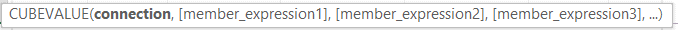 Par la suite, je désire insérer les ventes correspondantes à chacun des produits. Pour ce faire, je vais utiliser la fonction Excel VALEURCUBE (CUBEVALUE). Pour utiliser cette fonction, je dois également choisir une connexion et par la suite, je dois simplement spécifier les membres de l’expression désirés. Voici plus précisément les paramètres de cette fonction.