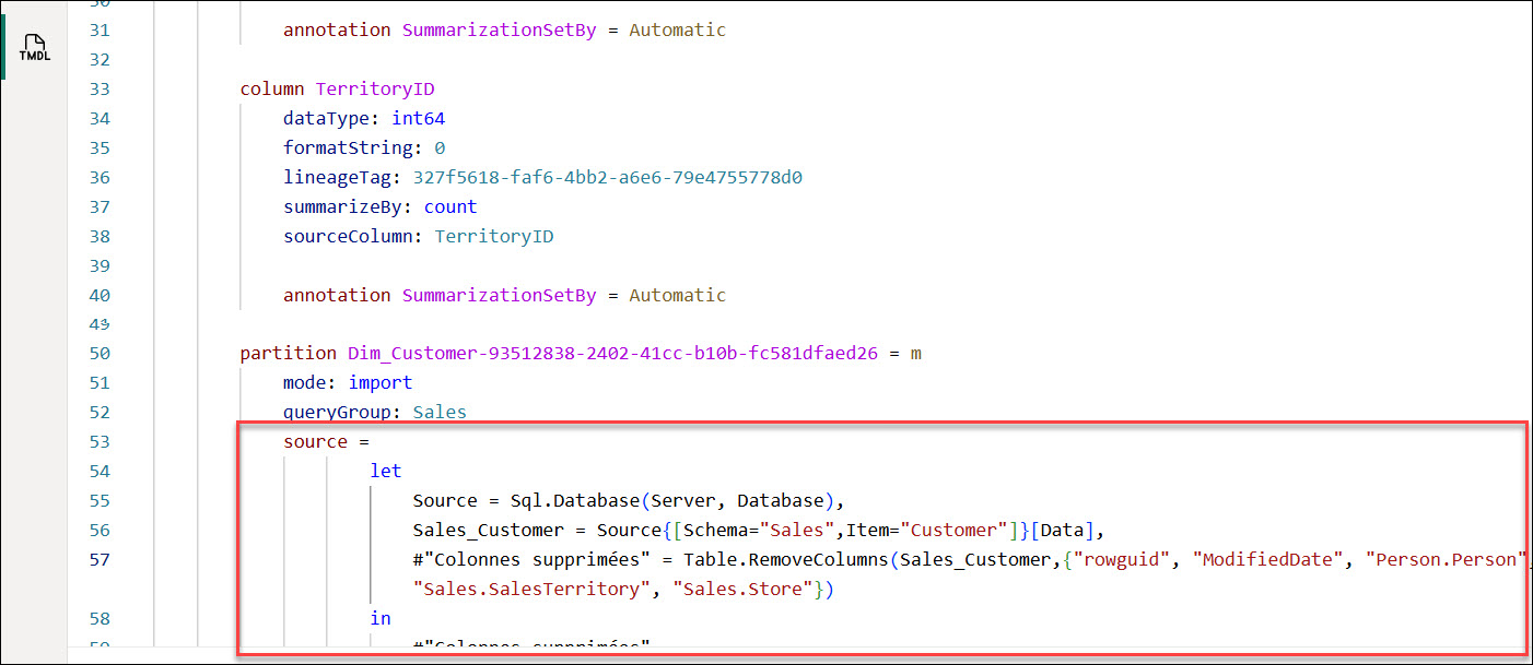 - Un contrôle total sur les propriétés du modèle, y compris celles non accessibles via l’interface graphique. On peut même y voir et modifier le code M des requêtes Power Query sous-jacentes.