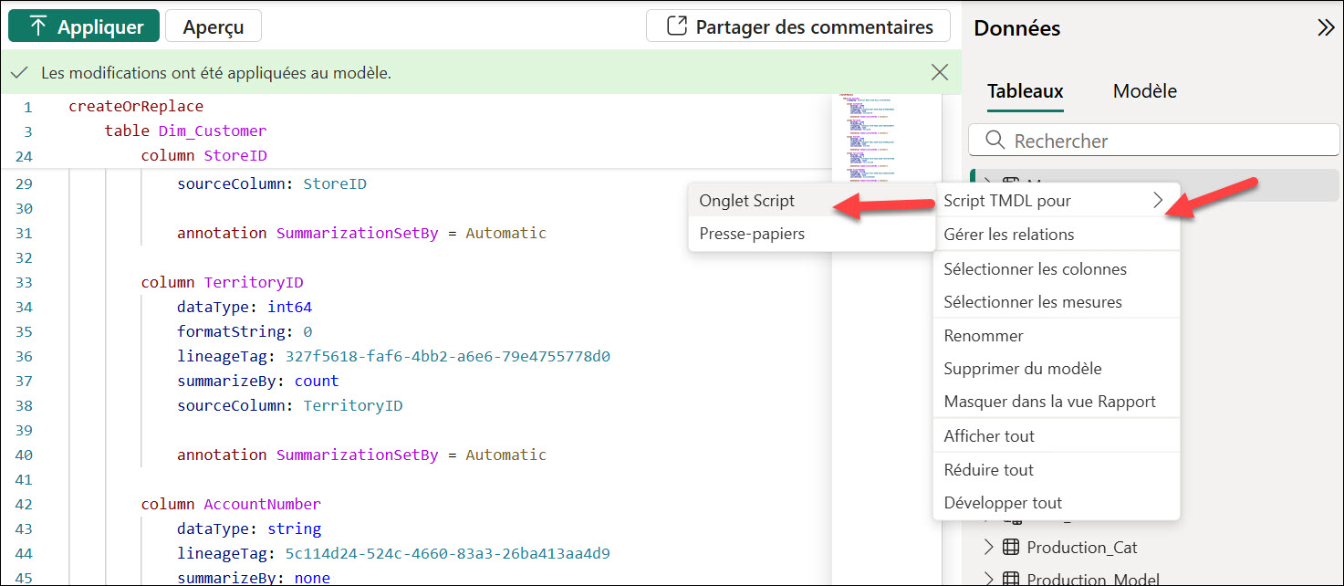 Pour ajouter un élément dans la vue TMDL et générer le script, vous pouvez glisser-déposer des objets depuis le volet Données vers l’éditeur. L’on peut également cliquer droit, puis choisir Script TMDL pour. Et ensuite, sélectionner Onglet Script.