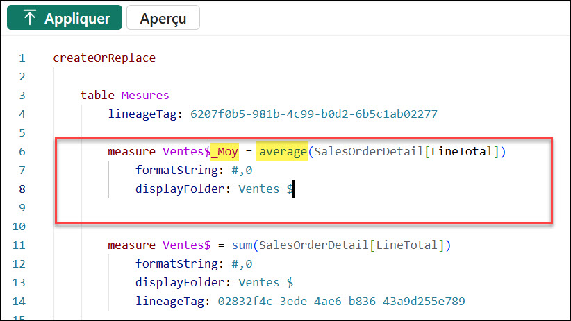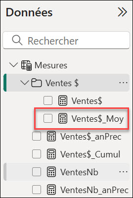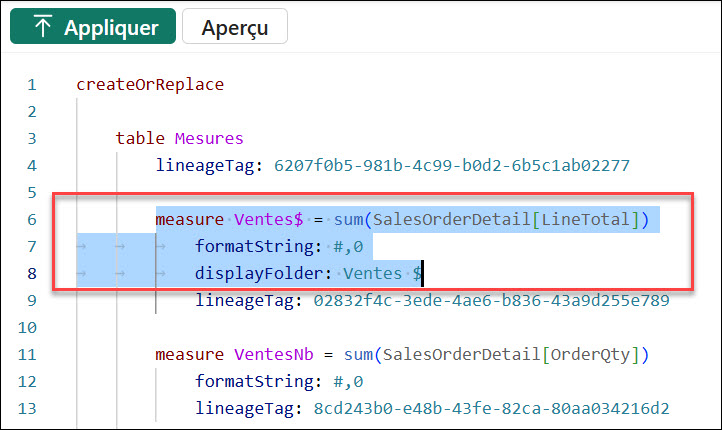 La nouvelle mesure est maintenant créée avec le même format et dans le même dossier que la mesure Ventes$, puisque j’ai copié l’information du formatString (#,0) et du displayFolder ( Ventes $).