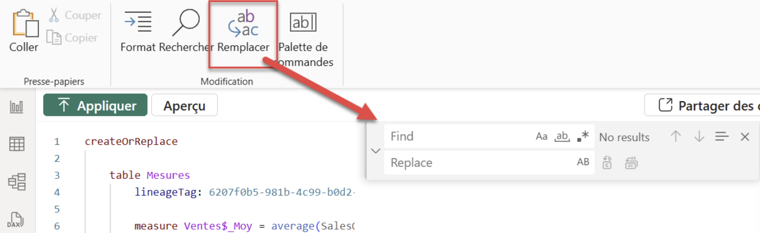 - Nettoyer les noms de tables (par exemple, en retirant les préfixes dim_ ou fact_, en modifiant des termes anglais pour français,…) en utilisant les fonctionnalités de Rechercher-Remplacer (Find/Replace) à partir du menu Remplacer.