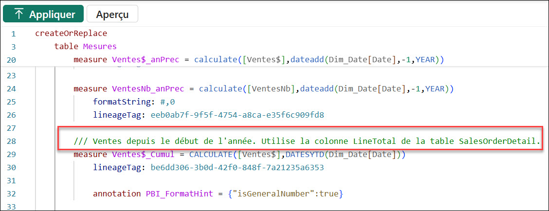 Par exemple, je peux copier la mesure Ventes$ en excluant la ligne du lineageTag qui doit être unique dans le modèle et qui sera ajouté automatique lors de l’exécution du script.