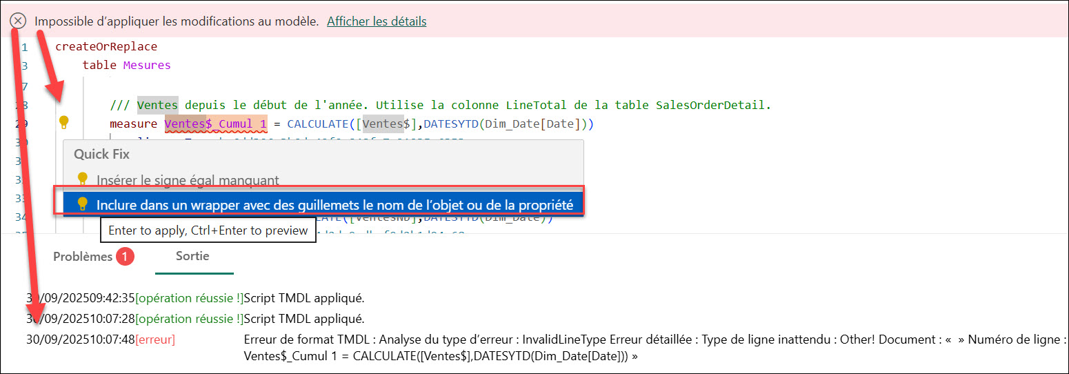 Par exemple, ici j’ai écrit un nom de mesure avec un espace sans l’entourer de guillemets, ce qui crée une erreur.