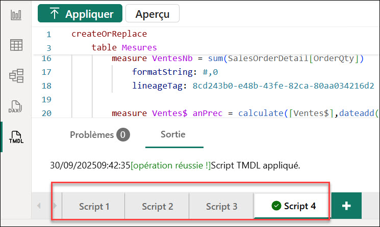 Chacun des scripts créés sera sauvegardé avec le fichier pbix (Power BI Desktop), vous permettant d’y accéder ultérieurement. Vous pouvez renommer les onglets au besoin.